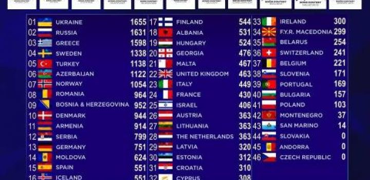Έτσι, από το 2004 μέχρι το 2014 η Ελλάδα έχει 1598 βαθμούς, μόλις 57 βαθμούς διαφορά από την 1η Ουκρανία και 33 από τη 2η Ρωσία. Αρκετά πιο κάτω η Κύπρος η οποία φιγουράρει στην 32η θέση.