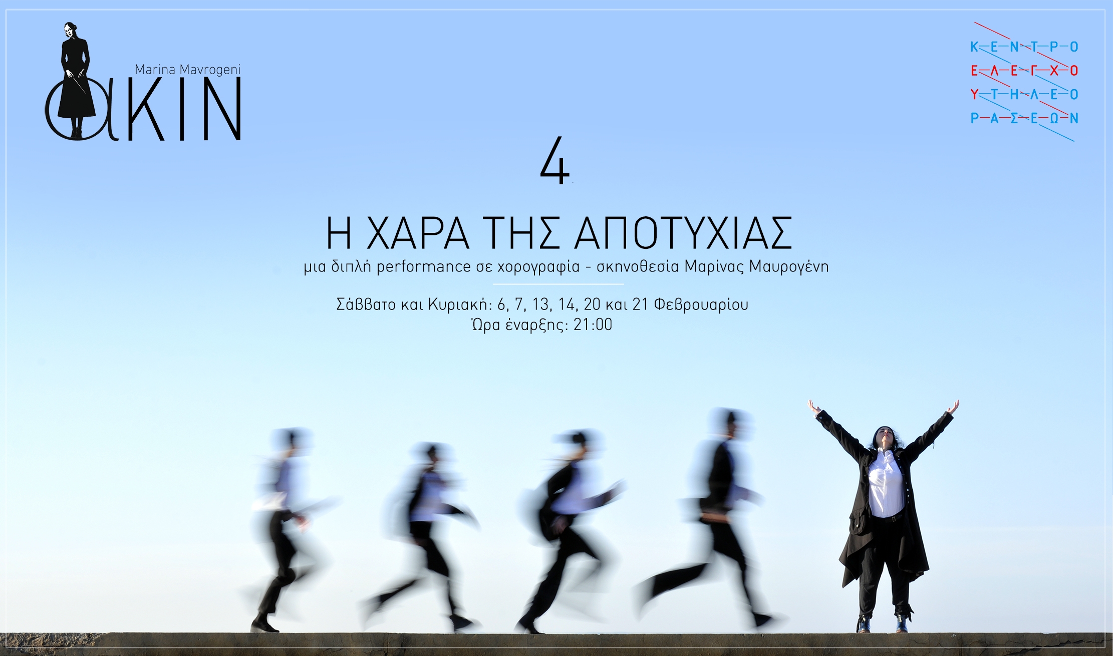 Η Μαρίνα Μαυρογένη σκηνοθετεί και χορογραφεί δύο παραστάσεις που παρουσιάζονται στο Κέντρο Ελέγχου Τηλεοράσεων για τα τρία πρώτα Σαββατοκύριακα του Φεβρουαρίου, Σάββατο 6, 13, 20 και Κυριακή 7, 14, 21. Ο θεατής, την ίδια βραδιά, θα παρακολουθήσει την performance “4” από την Ομάδα A ΚΙΝ και την solo performance της Μαρίνας Μαυρογένη “Η Χαρά της Αποτυχίας”.