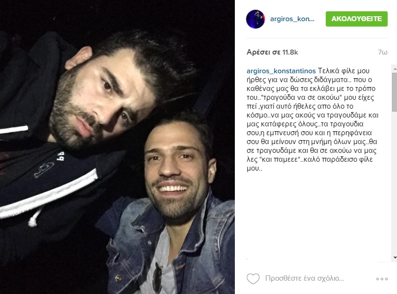 «Ήμασταν μαζί το προηγούμενο βράδυ, όχι σε όλη τη διάρκεια. Είχαμε πάει να τον δούμε στο μαγαζί που έκανε πρόβα. Σε μια φάση τον χάσαμε στο μαγαζί κι έμαθα ότι πήγε κάπου να διασκεδάσει. Εγώ πήγα για ύπνο κατά τις 5 το πρωί και με πήραν τηλέφωνο και μου είπαν “υπάρχει πρόβλημα”, ήμουν σοκαρισμένος. Όλη η Ελλάδα σοκαρίστηκε, ήταν μια στιγμή που ο καθένας πήρε τα μαθήματά του», είπε μεταξύ άλλων ο Κωνσταντίνος Αργυρός.