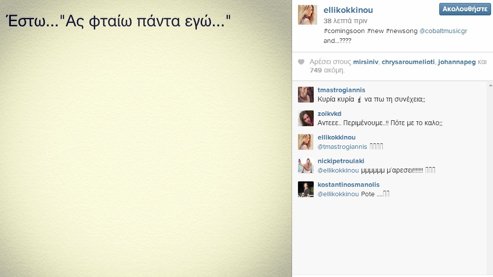 Το ολοκαίνουργιο τραγούδι της σηματοδοτεί και την επίσημη έναρξη της συνεργασίας της με τη Cobalt Music, και αναμένεται να κυκλοφορήσει την Κυριακή 29 Μαρτίου. Περίπου 9 μήνες μετά το τελευταίο της “Μάτια Κλειστά”, η Έλλη Κοκκίνου είναι έτοιμη για τη δισκογραφική της επιστροφή με ολοκαίνουργιο τραγούδι.