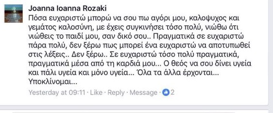 “Ποια μάνα είναι αυτή που δεν θα κάνει τα πάντα για το παιδί της, όταν το βλέπει να υποφέρει και να κινδυνεύει η ζωή του? Ποια? Στο ορκίζομαι Δημήτρη μου θα γυρίσω γη και ουρανό, γιατί αυτός είναι ο ρόλος της μαμάς, για να σε κάνω καλά! Στο ορκίζομαι Δημήτρη μου αν μου ζητήσουν τη ζωή μου για να είσαι εσύ καλά και αυτήν θα δώσω! Στο ορκίζομαι Δημήτρη μου, να μην ξανανιωσεις αυτό το πόνο και αυτές τις αιματεμεσεις, να μην ξανά νιώσουν τρόμο τα ματάκια σου σαν βλέπουν τόσο αίμα στο ρουχαλάκια σου και ολόγυρα σου, στο ορκίζομαι Δημήτρη μου να μην τρέμουν τα χεράκια σου από φόβο καθώς βγάζεις τόσο αίμα και προσπαθήσεις να σκουπισεις το στοματάκι σου… Στο ορκίζομαι να μην μου ξαναζητησεις “Βοήθεια Μαμά”, στο ορκίζομαι να μην ξανακουσεις κανέναν γιατρό να λέει μπροστά σου, τι δουλειά έχετε εδώ; Στο ορκίζομαι Δημήτρη ότι ποτέ μα ποτέ δεν θα σε ΑΦΗΣΩ ΕΓΏ!! Στο ορκίζομαι ότι θα κάνω τα πάντα να χαμογελάς μόνο αγόρι μου… Ιωαννα Ροζακη (Joanna Ioanna Rozaki) μητέρα Δημητράκη“.. ενώ ευχαρίστησε και τον Μπο για όσα έκανε.