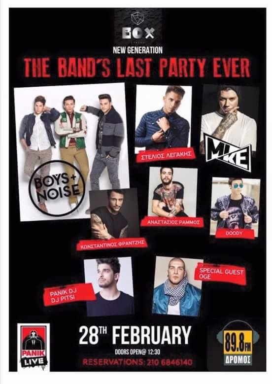 Το “The Band’s Last Party Ever” θα πραγματοποιηθεί στο Box Athens, ενώ μαζί τους θα τραγουδήσουν και οι: Στέλιος Λεγάκης, Mike, Αναστάσιος Ράμμος, Κωνσταντίνος Φραντζής, Doody, OGE και Dj Pitsi.