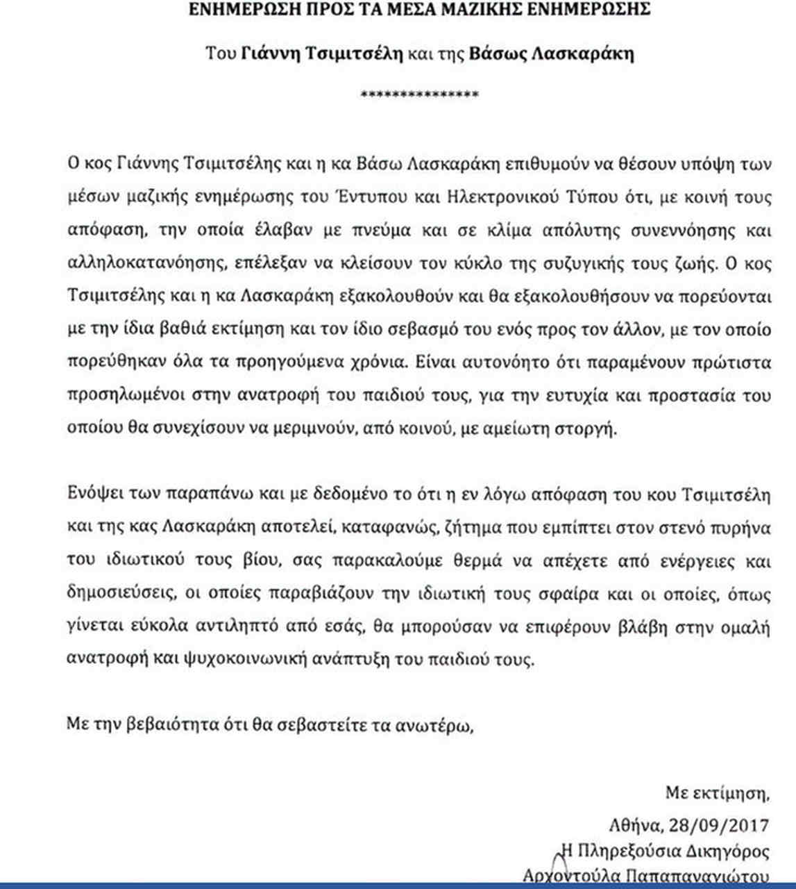 Συγκεκριμένα η ανακοίνωση μεταξύ άλλων αναφέρει: “O κ. Γιάννης Τσιμιτσέλης και η κα Βάσω Λασκαράκη επιθυμούν να θέσουν υπόψιν των Μέσων Μαζικής Ενημέρωση του έντυπου και ηλεκτρονικού τύπου, ότι με κοινή απόφαση τους απόφαση, την οποία έλαβαν με πνεύμα και σε κλίμα απόλυτης συνεννοήσης και αλληλεκοτανόησης, επέλεξαν να κλείσουν τον κύκλο της συζυγικής τους ζωής…”