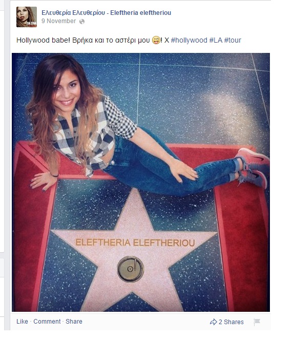 Η τραγουδίστρια βρέθηκε στο Hollywood, και αποφάσισε να φωτογραφηθεί ξαπλώνοντας δίπλα σε ένα από τα αστέρια. Στη συνέχεια, με τη βοήθεια του Photoshop πρόσθεσε το δικό της όνομα αστειευόμενη, και το ανέβασε στο Facebook!