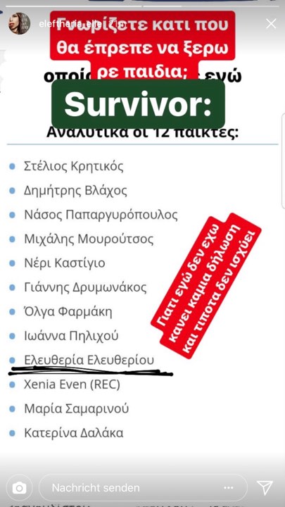Ωστόσο, στην χθεσινή εκπομπή της Ντορέτας, ανακοινώθηκε και το όνομα της Ελευθερίας Ελευθερίου. Πριν από λίγη ώρα, η τραγουδίστρια με ανάρτησή της στον προσωπικό της λογαριασμό στο Instagram, αδειάζει το ρεπορτάζ του ΣΚΑΪ, αποκαλύπτοντας πως δεν έχει δηλώσει ποτέ συμμετοχή στο survivor και πως τίποτε από όλα αυτά δεν ισχύουν.