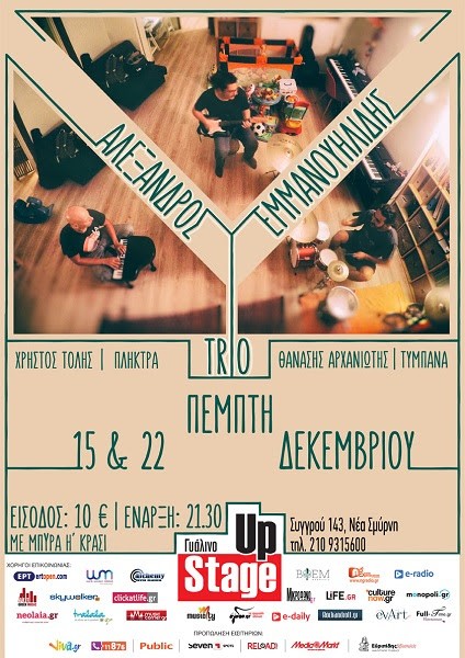 Ο Αλέξανδρος Εμμανουηλίδης με δύο εξαίρετους μουσικούς ονόματι Χρήστος Τόλης και Θανάσης Αρχανιώτης, σχηματίζοντας ένα μουσικό Τρίο ανεβαίνουν στο πατάρι του Γυάλινου Μουσικού Θεάτρου για δύο Πέμπτες στις 15 και 22 Δεκεμβρίου.