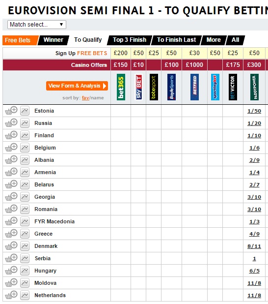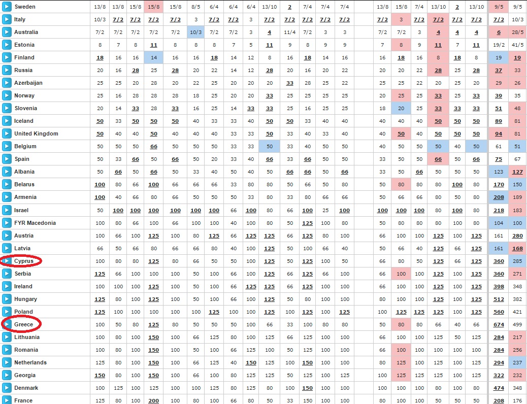 Στα στοιχήματα για το αν θα είμαστε νικητές στον 1ο ημιτελικό, ερχόμαστε στην 9η θέση, ενώ σχετικά με το αν θα περάσει ή οχι η χώρα μας στον τελικό, ερχόμαστε 11οι.