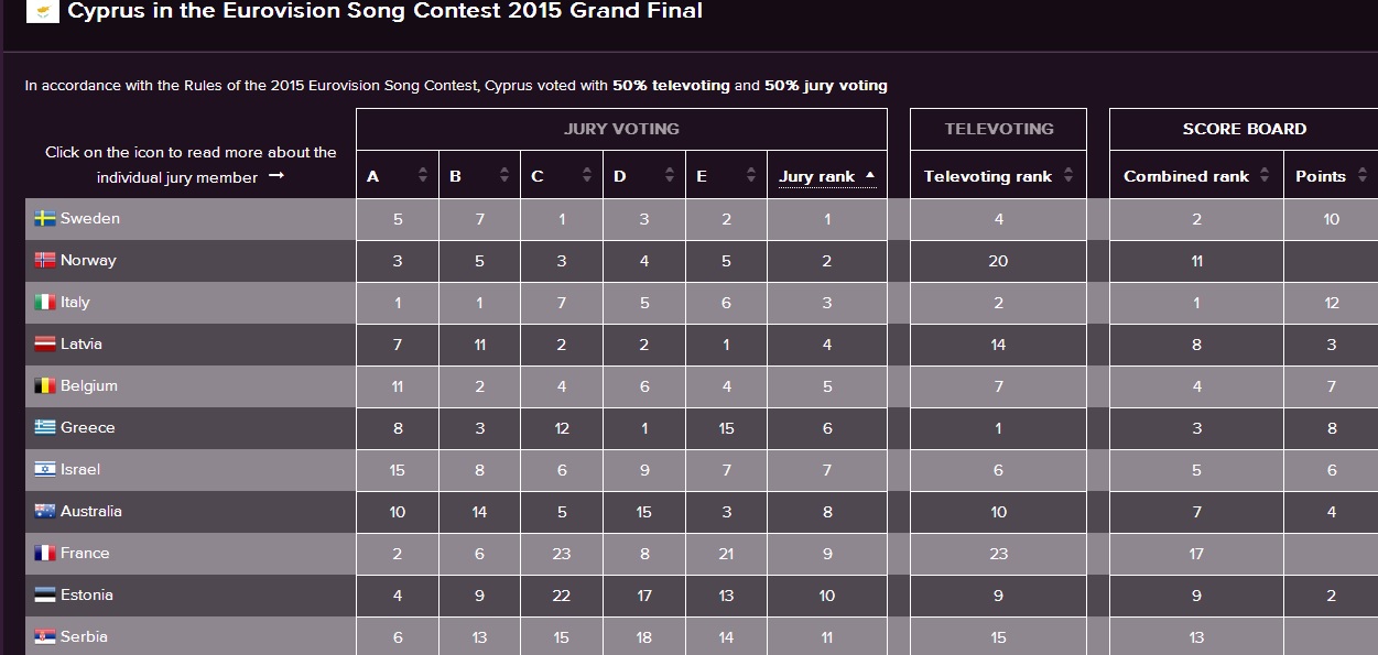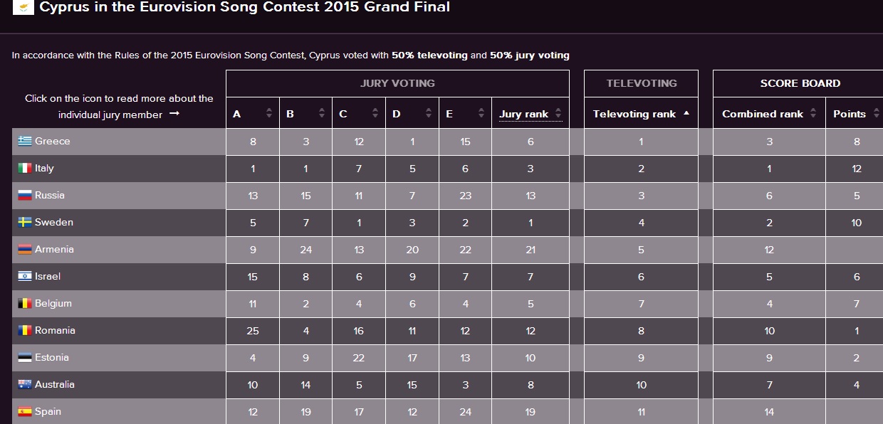 24/05/2015 στις 4:32Η Κυπριακή επιτροπή ψήφισε την Ελλάδα στην 6η θέση, και αυτό ήταν αρκετό για να δοθούν στην Ελλάδα μόλις 8 βαθμοί.