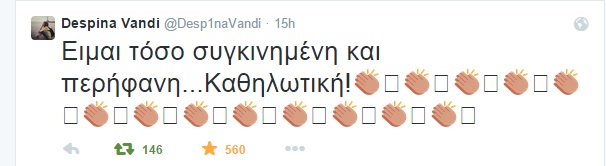 20/05/2015 στις 1:48Κάτι παραπάνω από χαρούμενη θα πρέπει να νιώθει η Δέσποινα Βανδή, με την πρόκριση της Μαρίας Έλενας Κυριάκου στον τελικό της Eurovision.