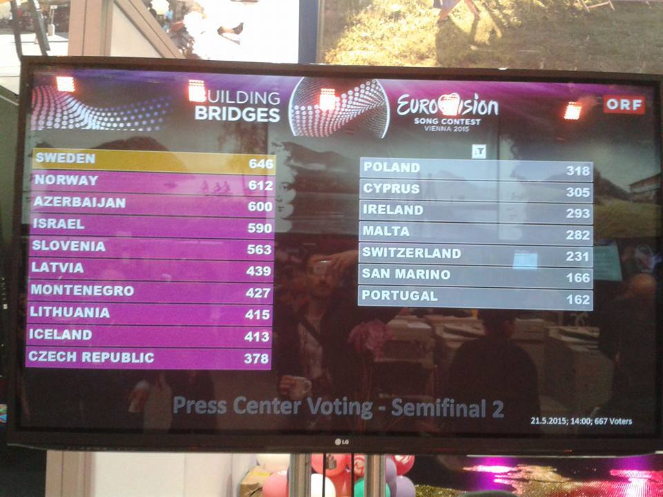 Πρώτη έρχεται η Σουηδία, ενώ ακολουθούν η Νορβηγία, το Αζερμπαϊτζάν και το Ισραήλ. Η Κύπρος έρχεται μόλις στη 12η θέση, ωστόσο πολλοί είναι αυτοί που θεωρούν πως η Κύπρος θα είναι μέσα στη χρυσή δεκάδα του τελικού.