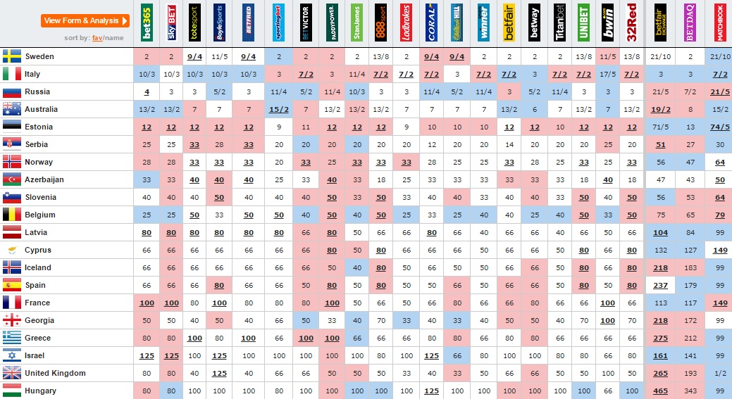Σύμφωνα με τα γραφεία σε όλη την Ευρώπη, η Ελλάδα έρχεται 17η σε πιθανότητες για νίκη στη Eurovision, ενώ η Κύπρος 12η. Στα στοιχήματα για το αν θα καταφέρουμε να μπούμε στο Top10 του τελικού, ερχόμαστε 12οι με την Κύπρο να ακολουθεί στη 13η θέση.