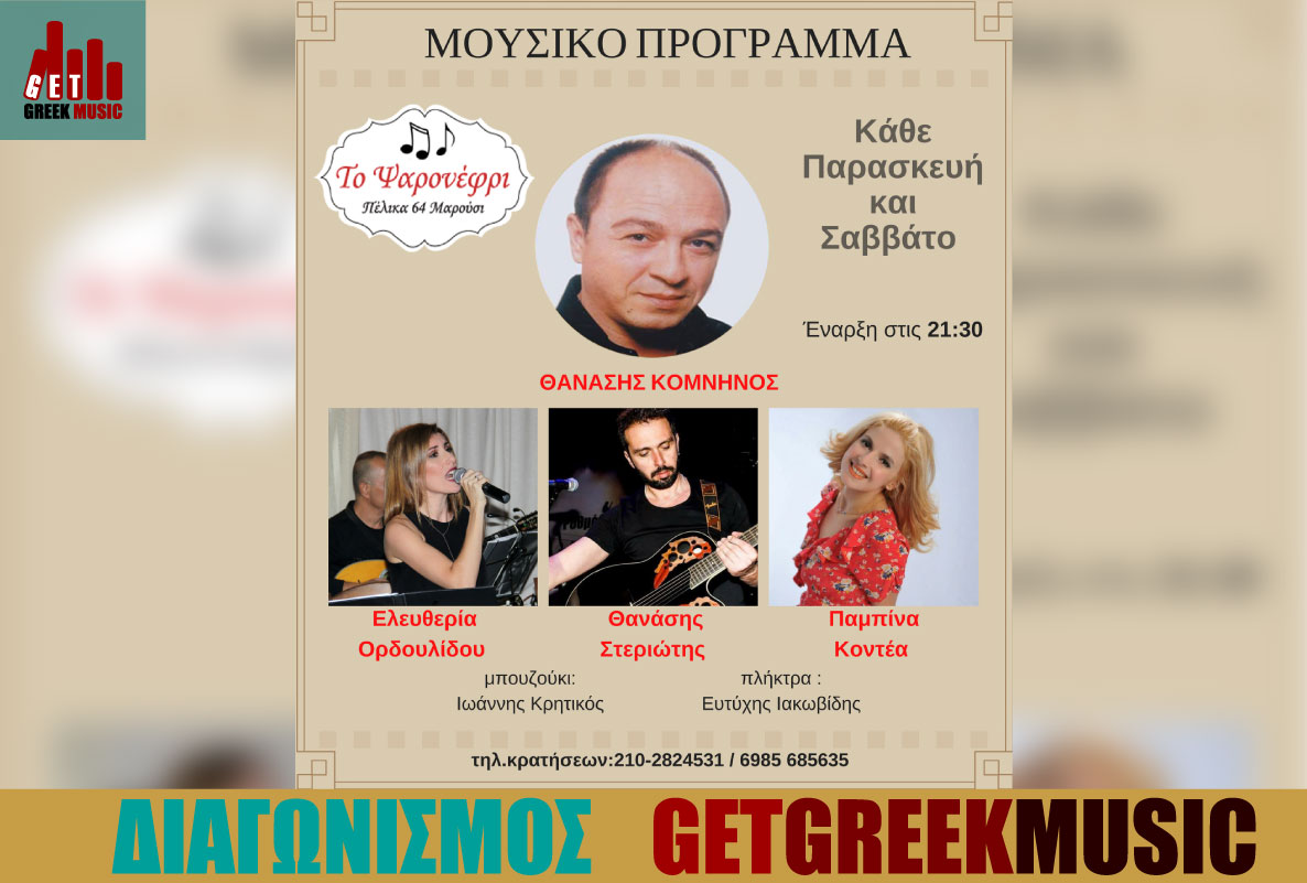 Ο Θανάσης Κομνηνός, η Παμπίνα Κοντέα, η Ελευθερία Ορδουλίδου και ο Θανάσης Στεριώτης μας υποδέχονται στο νέο μουσικό τους πρόγραμμα κάθε Παρασκεύη και Σάββατο στο εστιατόριο “Το Ψαρονέφρι”.