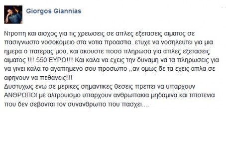 «Ντροπή και αίσχος για τις χρεώσεις σε απλές εξετάσεις αίματος σε πασίγνωστο νοσοκομείο στα νότια προάστια… Έτυχε να νοσηλευτεί για μια μέρα ο πατέρας μου και ακούστε πόσο πλήρωσα για απλές εξετάσεις αίματος! 550 ΕΥΡΩ! και καλά να έχεις τη δύναμη να τα πληρώσεις για να γίνει καλά το αγαπημένο σου πρόσωπο… Αν όμως δεν τα έχεις, απλά σε αφήνουν να πεθάνεις!!! Δυστυχώς, ενώ σε μερικές σημαντικές θέσεις πρέπει να υπάρχουν ΑΝΘΡΩΠΟΙ με αλτρουισμό, υπάρχουν ανθρωπάκια μηδαμινά και τιποτένια, που δεν σέβονται τον συνάνθρωπο που πάσχει…».