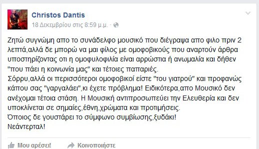 “Ζητώ συγνώμη από το συνάδελφο μουσικό που διέγραψα από φίλο πριν 2 λεπτά,αλλά δε μπορώ να μαι φίλος με ομοφοβικούς που αναρτούν άρθρα υποστηρίζοντας ότι η ομοφυλοφιλία είναι αρρώστια ή ανωμαλία και δήθεν “που πάει η κοινωνία μας” και τέτοιες παπαριές.