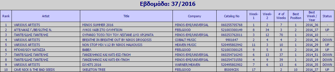 Για ακόμη μία εβδομάδα στην πρώτη θέση του Ifpi Chart συναντάμε τη συλλογή “Minos Summer 2016” και τον Παντελή Παντελίδη με 3 άλμπουμ στις θέσεις #3, #7 και #8.