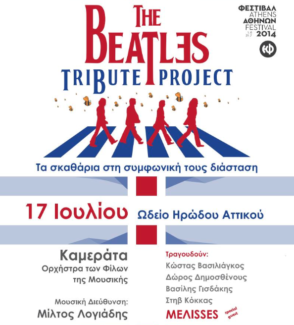 17/07/2014 στις 11:31Μια από τις πιο πολυσυζητημένες live εμφανίσεις της χρονιάς. Η Καμεράτα και ο Μίλτος Λογιάδης μας προσκαλούν σήμερα στο Ηρώδειο σ’ ένα μουσικό ταξίδι με μεγάλες επιτυχίες τον θρυλικών Beatles, σε ενορχήστρωση του Νίκου Πλατύρραχου, με τις Μέλισσες να πραγματοποιούν μια special guest εμφάνιση. Το The Beatles Tribute Project θέλει να δώσει στο κοινό την αίσθηση της καλοκαιρινής rock συναυλίας, με τις μεγαλύτερες επιτυχίες των Beatles να ηχούν κάτω από τη σκιά της Ακρόπολης.