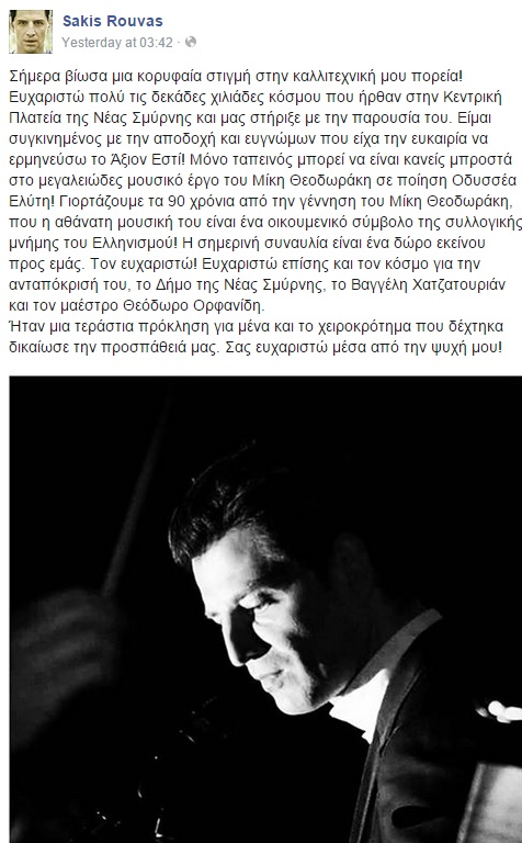 04/05/2015 στις 12:36Ο Σάκης Ρουβάς λίγη ώρα μετά την εμφάνιση του στην πλατεία Νέας Σμύρνης, τραγουδώντας το “Άξιον Εστί”, έγραψε στο Facebook: