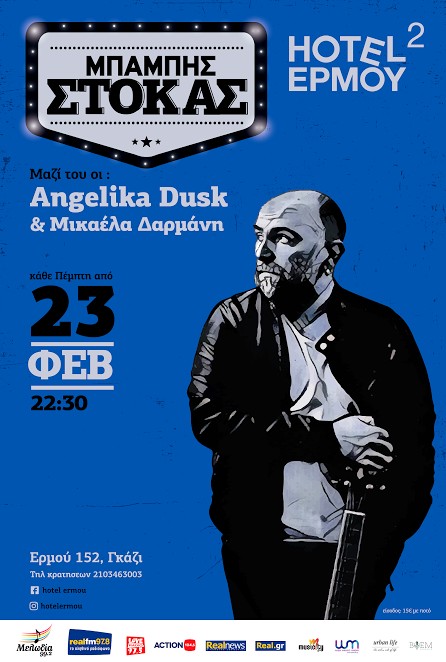 Από 23 Φεβρουαρίου και για 4 παραστάσεις κάθε Πέμπτη, ο Ο Μπάμπης Στόκας στο Hotel Ermou, μαζί με δύο φρέσκα κορίτσια, την Angelika Dusk και τη Μικαέλα Δαρμάνη σε ένα διπλό πρόγραμμα καρδιάς.