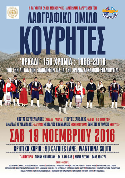 Μετά από πρόσκληση της Παγκρήτιας Ένωσης Μελβούρνης – Αυστραλίας, αποστολή του Λαογραφικού Ομίλου “Κουρήτες” αποτελούμενη από 24 μέλη, ταξίδεψε χιλιάδες χιλιόμετρα για να βρεθεί με τους Κρήτες της Μελβούρνης για να τιμήσει τους εορτασμούς για την 150η Επέτειο του Ολοκαυτώματος της Ιεράς Μονής Αρκαδίου.