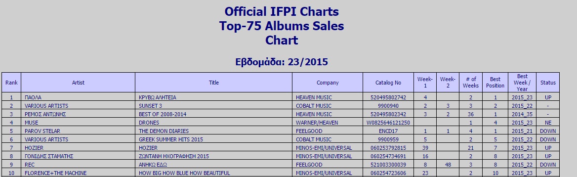 Ο δίσκος που κυκλοφόρησε πριν από δύο εβδομάδες από τη Heaven Music, βρίσκεται γι’ αυτήν την εβδομάδα στο #1 του Ifpi Chart πωλήσεων, με άνοδο 3 θέσεων. Στο #2 βρίσκεται η συλλογή “Sunset 3” της Cobalt Music, ενώ στο #3 η συλλογή “Best Of 2008-2014” του Αντώνη Ρέμου.