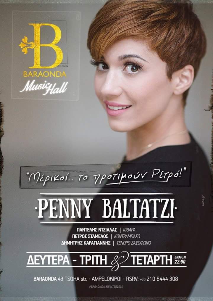 Στο Baraonda Music Hall η Πέννυ Μπαλτατζή, μας πιάνει από το χέρι, για να κάνουμε ένα ρομαντικό μουσικό περίπατο, συντροφιά με ένα κόντρα μπάσο, ένα σαξόφωνο και μια κιθάρα.
