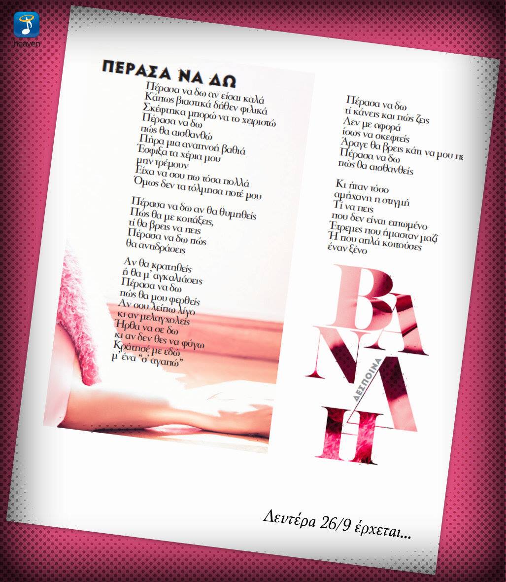6 μέρες πριν την κυκλοφορία του νέου της single με τίτλο “Πέρασα να δω“, η Δέσποινα Βανδή μας αποκαλύπτει τους στίχους του τραγουδιού.