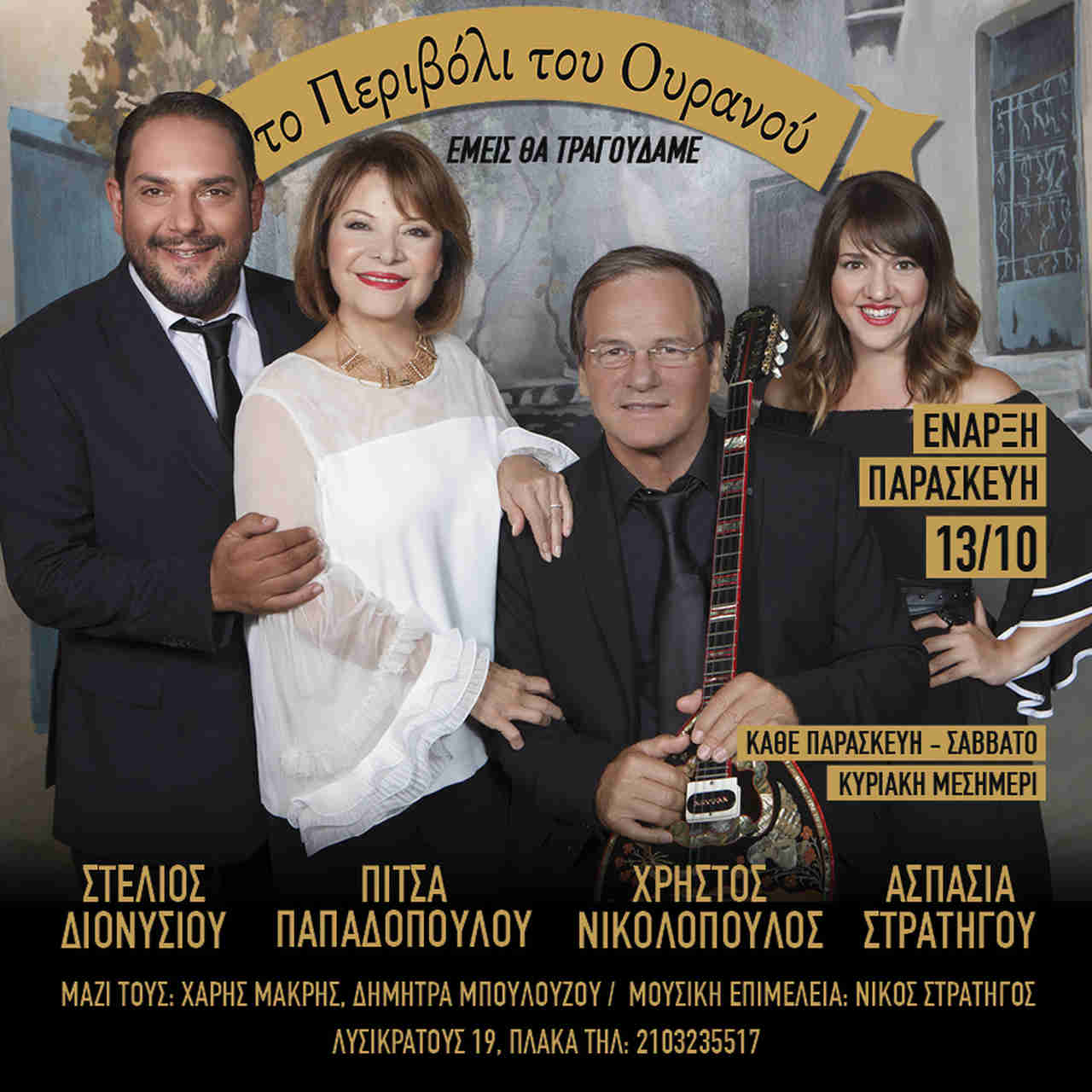 Με όπλα το καλό λαϊκό τραγούδι και την ποιότητα στη νυχτερινή διασκέδαση αλλά και την ισχυρή σχέση που διατηρούν με ένα μεγάλο κοινό, ο Χρήστος Νικολόπουλος, η Πίτσα Παπαδοπούλου, ο Στέλιος Διονυσίου και η υπέροχη Ασπασία Στρατηγού ξεκινούν τις εμφανίσεις τους ξέροντας ότι θα κερδίσουν και φέτος το στοίχημα της επιτυχίας.