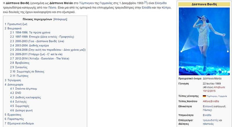 Συγκεριμένα στο γνωστό site Wikipedia την περασμένη Παρασκευή πέρα από την ημερομηνία γέννησης της γνωστής τραγουδίστριας, εμφανίστηκε και η ημερομηνία θανάτου της: 10 Δεκεμβρίου 2015!