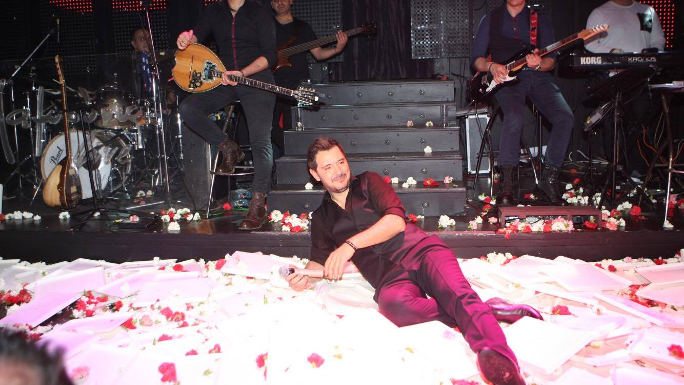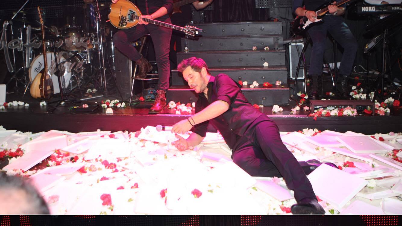 Το «βουνό» από λουλούδια που του «έχτισαν» το βράδυ του Σαββάτου είχε ως αποτέλεσμα να γλιστρήσει και να πέσει, χωρίς να χάσει όμως το κέφι του.