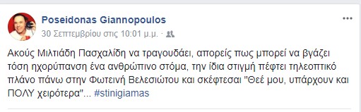 “Ακούς Μιλτιάδη Πασχαλίδη να τραγουδάει, απορείς πως μπορεί να βγάζει τόση ηχορύπανση ένα ανθρώπινο στόμα, την ίδια στιγμή πέφτει τηλεοπτικό πλάνο πάνω στην Φωτεινή Βελεσιώτου και σκέφτεσαι “Θεέ μου, υπάρχουν και ΠΟΛΥ χειρότερα”… #stinigiamas”