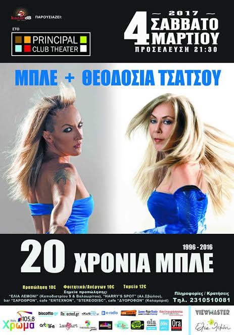 Έπειτα από 20 χρόνια επιτυχίες οι ΜΠΛΕ και ΘΕΟΔΟΣΙΑ ΤΣΑΤΣΟΥ θα το γιορτάσουν με μια μεγάλη συναυλία το Σάββατο 4 Μαρτίου στο Principal Club Theater στη Θεσσαλονίκη.