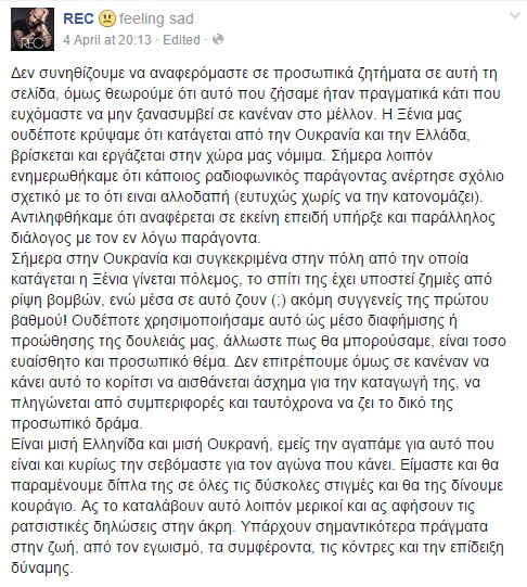 06/04/2015 στις 1:51Ένα ασυνήθιστο μήνυμα δημοσιοποίησαν οι REC το απόγευμα του Σαββάτου, με αφορμή κάποια σχόλια ραδιοφωνικών παραγωγών για την καταγωγή της Ξένιας, της γυναικείας φωνής του συγκροτήματος.