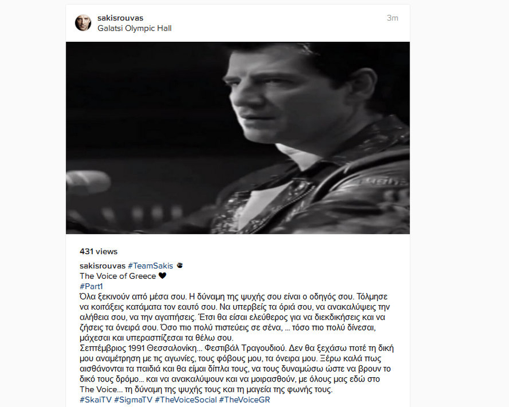 Σεπτέμβριος 1991 Θεσσαλονίκη… Φεστιβάλ Τραγουδιού. Δεν θα ξεχάσω ποτέ τη δική μου αναμέτρηση με τις αγωνίες, τους φόβους μου, τα όνειρα μου. Ξέρω καλά πως αισθάνονται τα παιδιά και θα είμαι δίπλα τους, να τους δυναμώσω ώστε να βρουν το δικό τους δρόμο… και να ανακαλύψουν και να μοιρασθούν, με όλους μας εδώ στο The Voice… τη δύναμη της ψυχής τους και τη μαγεία της φωνής τους.”