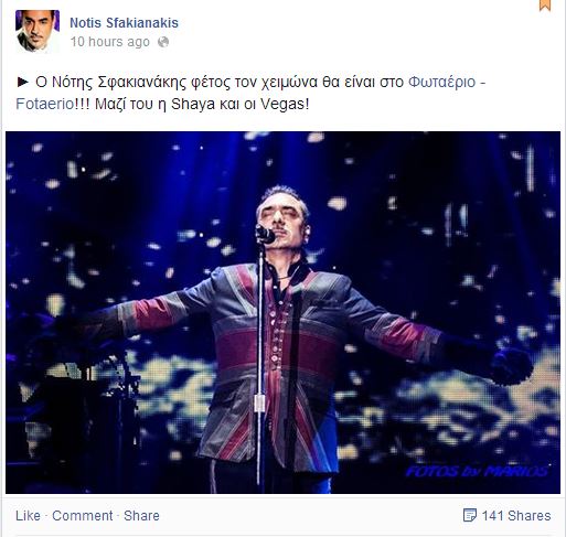 Την ανακοίνωση την έκανε ο ίδιος ο Νότης Σφακιανάκης από τη σελίδα του στο Facebook, ενώ μαζί του θα εμφανίζονται οι Vegas (διάβασε εδώ τι δήλωσαν για τη διάλυση τους) αλλά και η Shaya. Οι Vegas άλλωστε συνηθίζουν να εμφανίζονται στο πλευρό μεγάλων Ελλήνων λαϊκών καλλιτεχνών. Στο παρελθόν έχουν συνεργαστεί με το Βασίλη Καρρά, τον Αντώνη Ρέμο αλλά και με το Γιώργο Μαζωνάκη!
