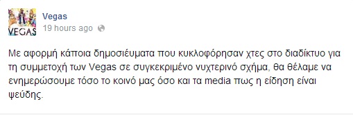 Updated: Οι Vegas διέψευσαν μέσα από τη σελίδα τους στο Facebook τη συνεργασία, ενώ η δημοσίευση της σελίδας του Νότη Σφακιανάκη “κατέβηκε” από το Facebook.