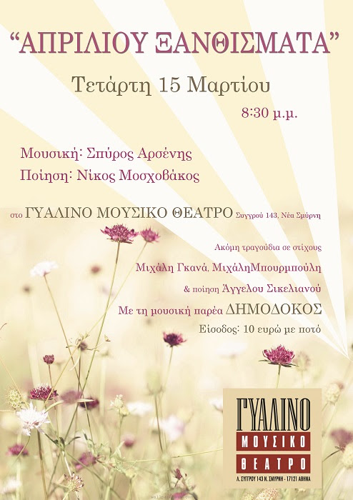 Ο  Ιθακήσιος τραγουδοποιός, Σπύρος Αρσένης παρουσιάζει την Τετάρτη 15 Μαρτίου, στο Γυάλινο Μουσικό Θέατρο– Up Stage στην Αθήνα τη μουσική ενότητα «Απριλίου Ξανθίσματα» σε στίχους του αξιόλογου ποιητή Νίκου Μοσχοβάκου.