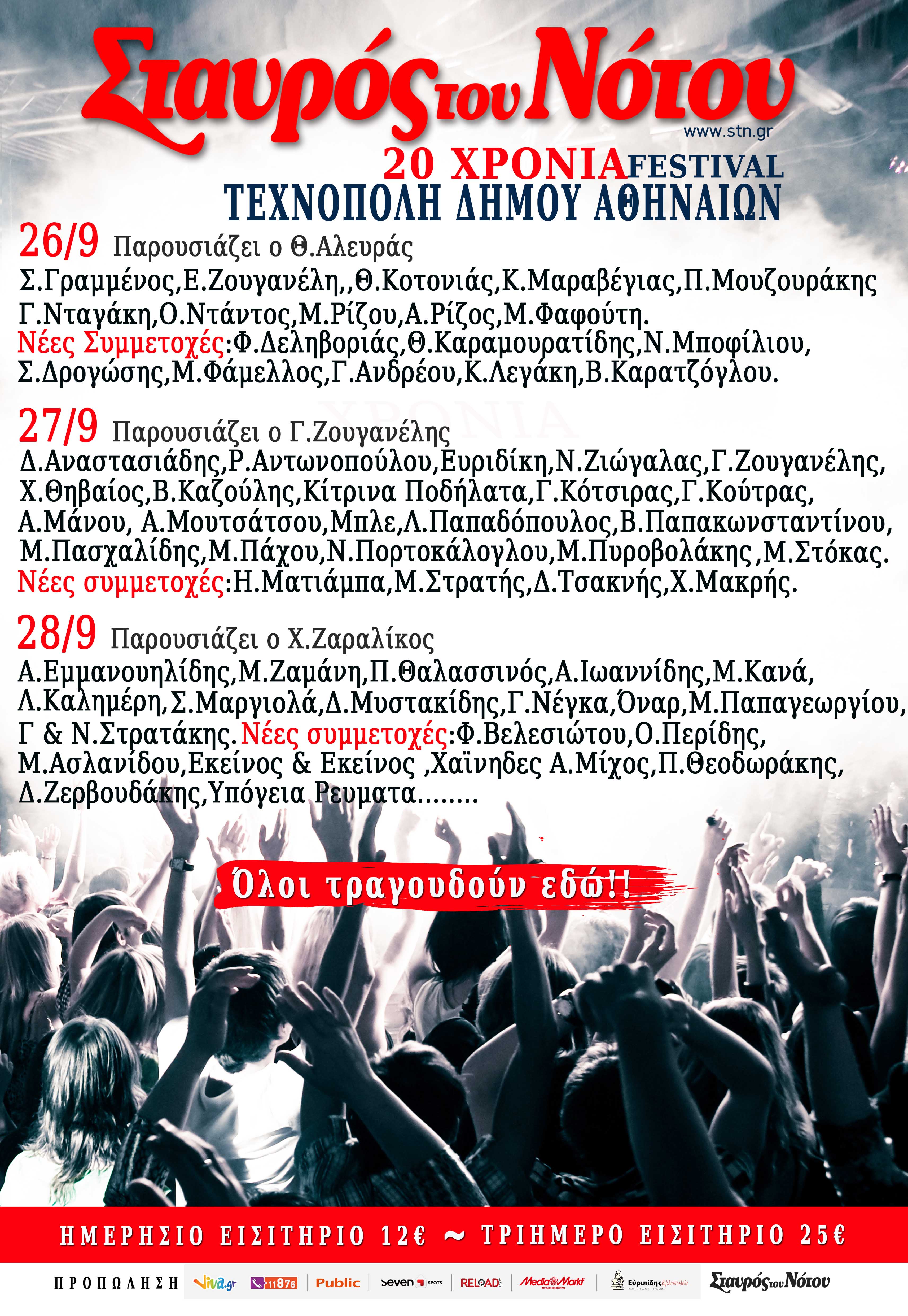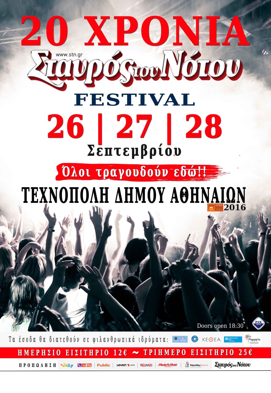 14/09/2016 στις 5:46Ο Σταυρός του Νότου γίνεται 20 χρονών και το γιορτάζει. Στην τριήμερη γιορτή που θα πραγματοποιηθεί στην Τεχνόπολη του Δήμου Αθηναίων, στις 26, 27 και 28 Σεπτεμβρίου, θα δώσουν το παρόν πάνω από 50 καλλιτέχνες που πέρασαν από τις σκηνές του πιο σημαντικού μουσικού χώρου της Αθηνας τα τελευταία είκοσι χρόνια.