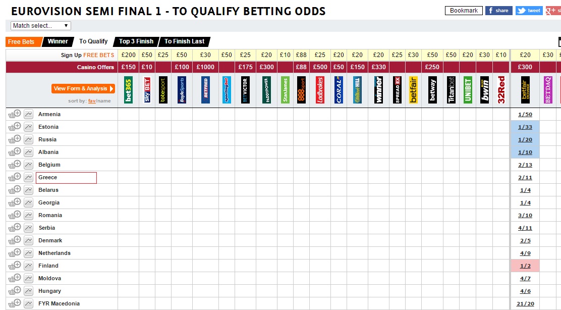 Ενώ στα στοιχήματα του πρώτου ημιτελικού για το ποιες χώρες θα περάσουν στο μεγάλο τελικό, η Ελλάδα έρχεται 6η.