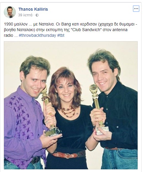 “1990 μαλλον … με Ναταλια. Οι Bang κατι κερδισαν (χαχαχα δε θυμαμαι – βοηθα Ναταλακι) στην εκπομπη της “Club Sandwich” στον antenna radio … #throwbackthursday #tbt”