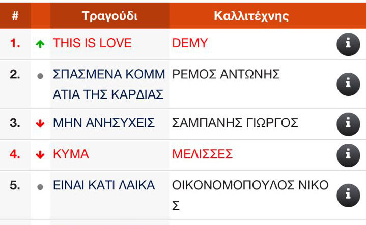 Στην κορυφή του Ελληνικού Official IFPI AirPlay Chart By MediaInspector για ακόμη αφορά το Χρυσό κορίτσι της δισκογραφίας, η Demy με το This is love.