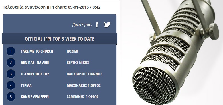 Δεν πρόκειται για κάποιο ελληνικό τραγούδι, αλλά για το “Take Me To Church” του Hozier που ανέβαινε με ταχύτατους ρυθμούς προς την κορυφή τις τελευταίες εβδομάδες. Έτσι, ενώ τις προηγούμενες μέρες βρισκόταν σταθερά μέσα στη πεντάδα, σήμερα κατάφερε να ρίξει το Νίκο Βέρτη και το “Δεν πάει να λέει” από την κορυφή, αφήνοντας πίσω 4 ελληνικά τραγούδια, και τα 4 από άνδρες!