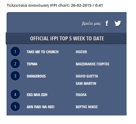 Μπορεί ο Γιώργος Μαζωνάκης και το “Τέρμα” να βρίσκονται για 7 συνεχόμενες εβδομάδες στην κορυφή του airplay chart, φαίνεται όμως πως τη θέση του ετοιμάζεται να πάρει η Πάολα με το “Έχω Μια Ζωή”. Το single της Πάολα έχει σταθερή ανοδική πορεία, ενώ για σήμερα το βλέπουμε στο #4 του γενικού chart, μόλις 2 θέσεις πίσω από το “Τέρμα” και μια ανάσα πριν από την κορυφή στο ελληνικό chart.
