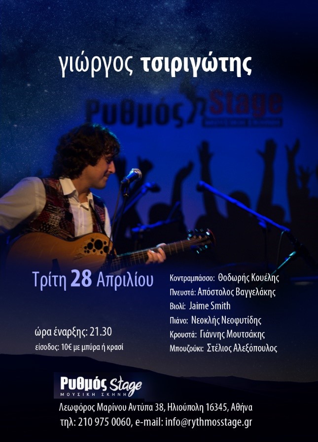 Ο Γιώργος Τσιριγώτης επιστρέφει στο Ρυθμός Stage την Τρίτη 28 Απριλίου για να παρουσιάσει τα νέα του κομμάτια σε δική του μουσική και στίχους του Πρόδρομου Κοσμίδη.
