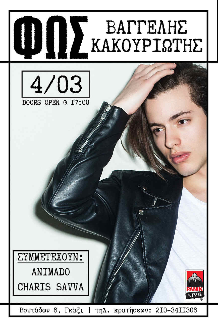 Ο Βαγγέλης Κακουριώτης μας προσκαλεί σε ένα μοναδικό Live το Σάββατο 4 Μαρτίου στο «ΦΩΣ: The next generation». Μαζί του ο ράπερ MIKE, αλλά και οι ταλαντούχες Animado και Χάρις Σάββα.