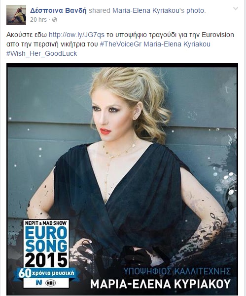Μπορεί φέτος να μην παρουσιάζει το διαγωνισμό, όπως έκανε τα τελευταία δύο χρόνια, ωστόσο η Δέσποινα Βανδή φαίνεται να είναι φανατική του διαγωνισμού. Με ένα post της στο Facebook, εκδήλωσε την αγάπη της και τη στήριξη στην περσινή νικήτρια του Voice, Μαρία Έλενα Κυριάκου. Λογικό, αρκεί να θυμηθούμε πως η Μαρία Έλενα νίκησε με τη βοήθεια της Δέσποινας ως coach της!