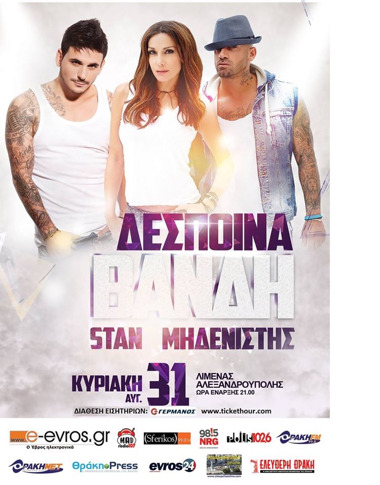 Η τελευταία μέρα του καλοκαιριού υποδέχεται τη Δέσποινα Βανδή, τον Stan (δες εδώ τη γυμνή φωτό που ανέβασε στο Facebook και προκάλεσε πανικό) και το Μηδενιστή στην Αλεξανδρούπολη, για ένα απολαυστικό live!