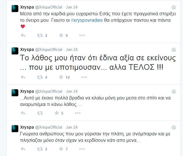 Ένα περίεργο εσωτερικό ξέσπασμα είχε η Χρύσπα το βράδυ του Σαββάτου στο Twitter.