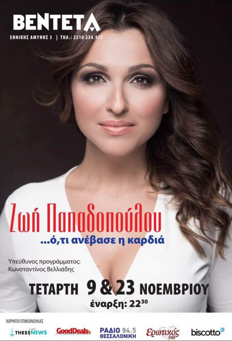 Η Ζωή Παπαδοπούλου θα βρίσκεται για 2 Τετάρτες (9 και 23 Νοεμβρίου) στη Θεσσαλονίκη και στον υπέροχο χώρο της “Βεντέτας” παρουσιάζοντας μία μουσική παράσταση με τίτλο “Ό,τι ανέβασε η καρδιά“.